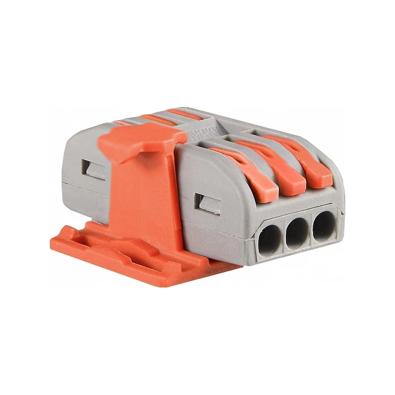 Соединитель работает по принципу рычажного механизма, что позволяет легко соединять и разъединять клеммы без дополнительных инструментов. Блокировка проводов происходит путем нажатия на рычаг, что обеспечивает надежный контакт и предотвращает случайное разъединение.