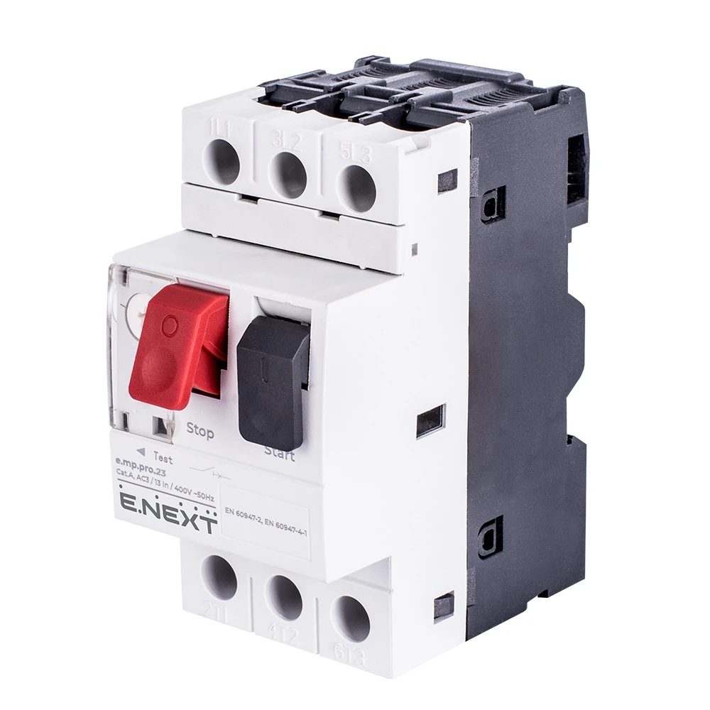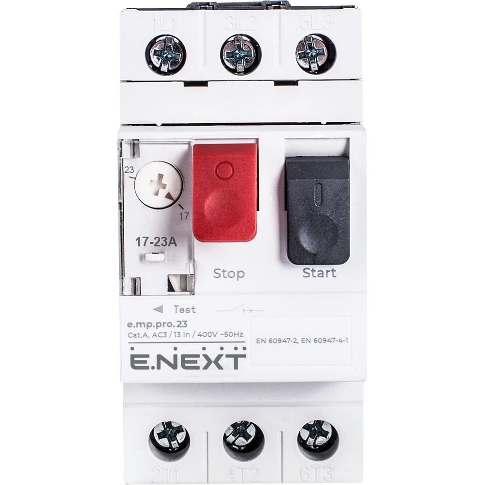 Автомат для защиты двигателя 17-23A 15kA p004007 e.mp.pro.23 E.NEXT предназначен для управления и защиты трехфазных асинхронных двигателей с короткозамкнутым ротором. Он надежно защищает оборудование от коротких замыканий, токов перегрузки, а также оказывает опосредованное действие на ситуации с обрывом и перекосом фаз.