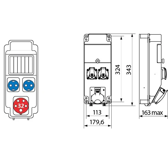 Набор включает в себя 1 розетку на 32A с тремя фазами, нейтралью и заземлением, а также две розетки по 16A с защитой от перегрузок. Номинальный ток устройства составляет 32A, а степень защиты IP44 гарантирует надежную защиту от попадания влаги и пыли. Корпус выполнен из термопластика ABS, устойчивого к огню и высоким температурам до 650 °C, что обеспечивает долговечность и надежность эксплуатации. Установка данной модели предполагает стационарный монтаж.