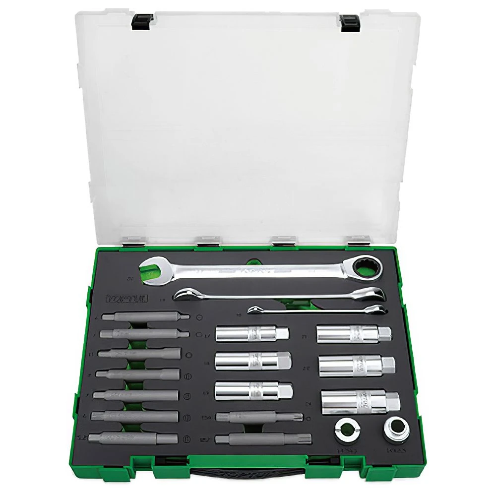Полный комплект TOPTUL GZC2008 включает в себя все необходимые инструменты для работы с амортизаторами различных марок автомобилей, таких как Volkswagen, Audi, Mercedes, Honda, Fiat, BMW и многих других. Этот набор состоит из 20 инструментов, которые упакованы в удобный пластиковый кейс, обеспечивая надежную защиту и легкость транспортировки. В состав набора входят различные разъемы и специальные удлинители, что делает его универсальным решением для профессиональных механиков и автолюбителей.