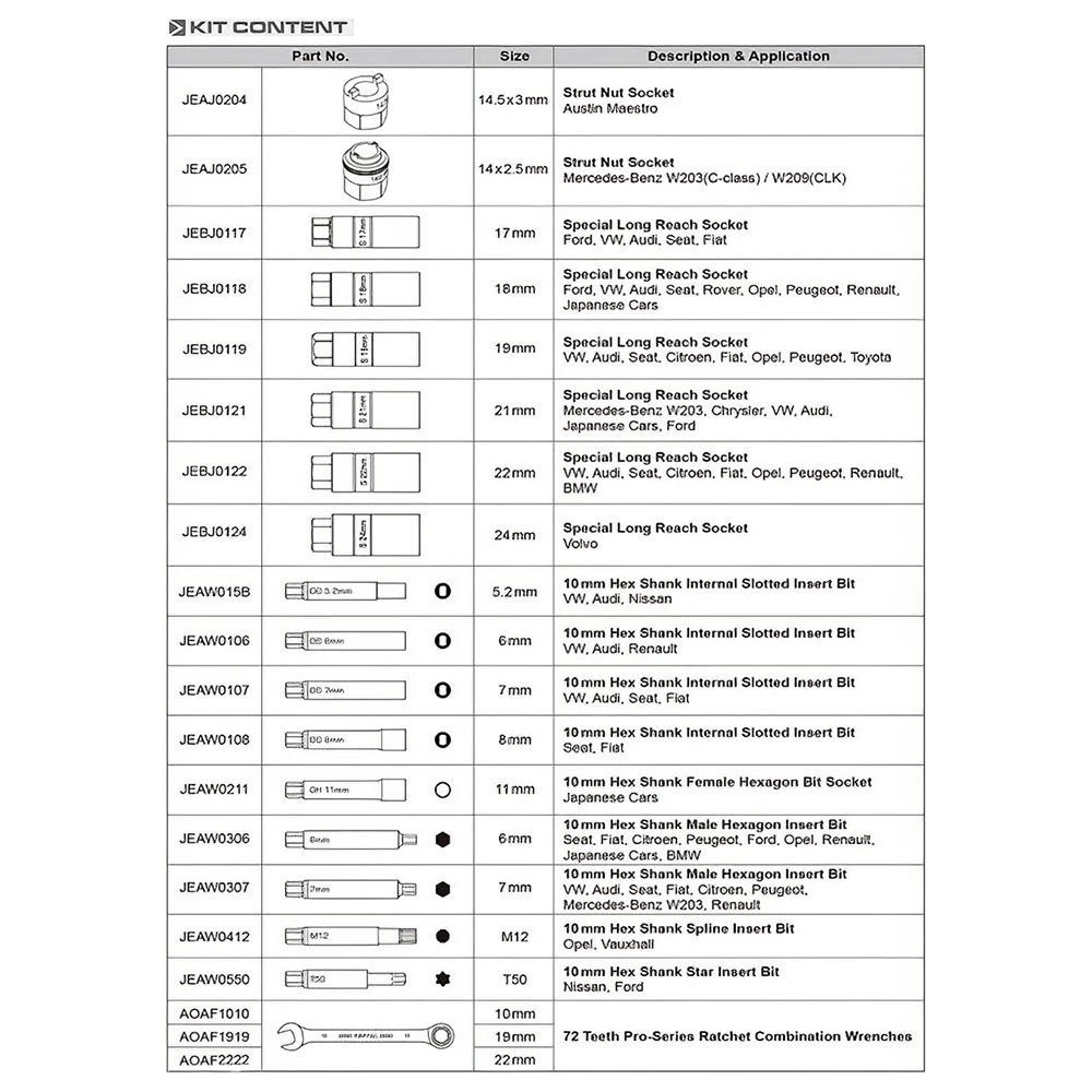 Одной из отличительных особенностей набора является его многофункциональность и возможность работы с различными системами амортизаторов. Разнообразие насадок и ключей позволяет легко подбирать нужный инструмент для конкретной марки автомобиля. Например, в комплект входят головки для разборки стоек, подходящие для моделей Austin Maestro, Mercedes-Benz W203 и W209, а также специальные удлинители для Ford, VW, BMW, Audi и других марок.