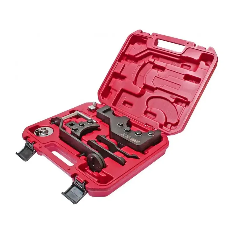 В комплект входят ключевые элементы, необходимые для работы с двигателями VW Touareg и Transporter 2.5 TDI, а также 4.9D/TDI. Основными преимуществами набора фиксаторов являются долговечность материалов, удобство в использовании и простота монтажа. Набор полностью соответствует требованиям профессионалов в области автосервиса и позволяет проводить обслуживание автомобилей с максимальной эффективностью. Этот набор может значительно сократить время работы и уменьшить вероятность повреждения компонентов.