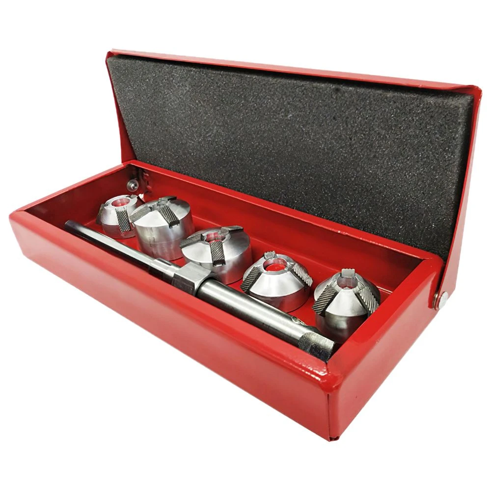 Особенностью данного набора является наличие режущих ножей с фиксированными углами, обеспечивающих точность обработки. В набор входят фрезы, позволяющие обрабатывать фаски седел клапанов под углом 45º, 30º и 20º, соответственно требованиям, установленным производителем двигателя. Такой подход гарантирует восстановление первоначальной геометрии седел, что в свою очередь способствует более эффективной работе двигателя.