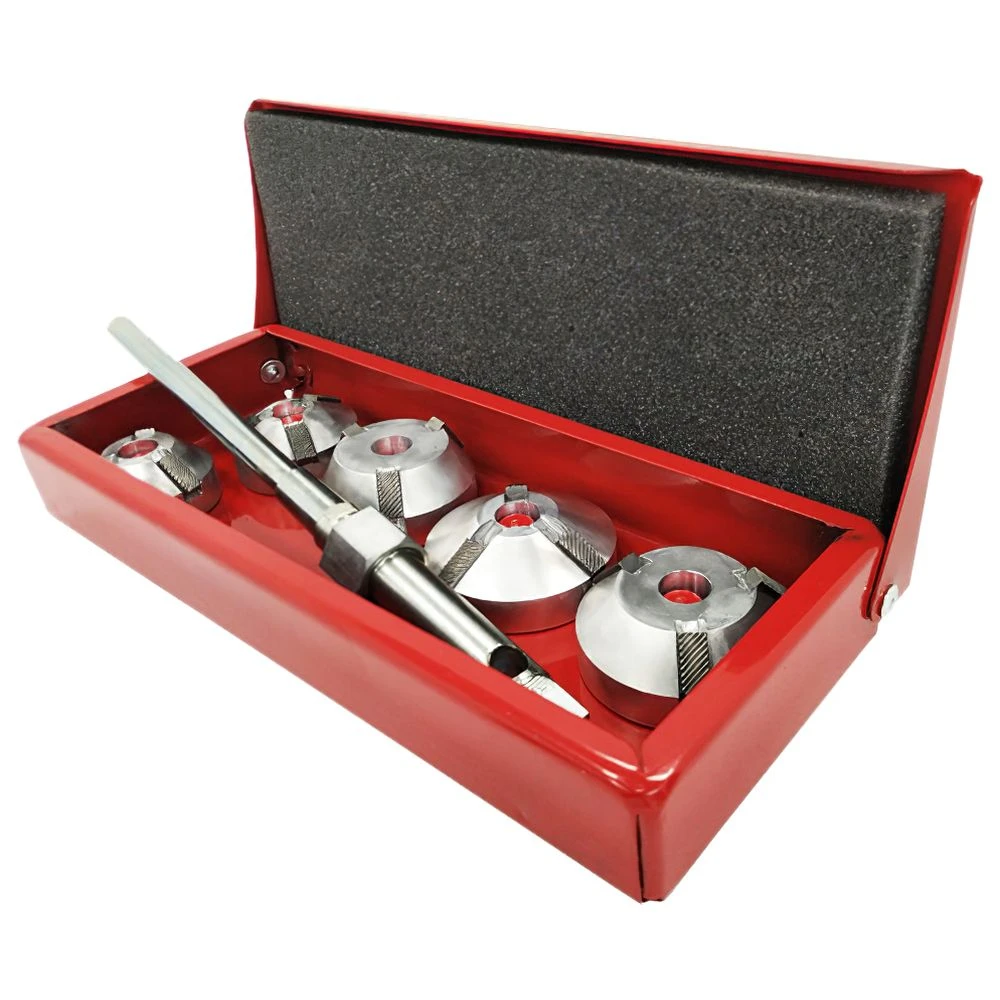 Каждая фреза в наборе оснащена режущими ножами с фиксированным положением, что обеспечивает точность и стабильность в процессе работы. С помощью данного инструмента можно обрабатывать седла клапанов, соблюдая рекомендованные заводом изготовителем параметры углов и диаметров, что критически важно для оптимизации работы двигателя. Набор включает фрезы с различными диаметрами и углами, что позволяет варьировать обработку в зависимости от специфики конкретного двигателя.