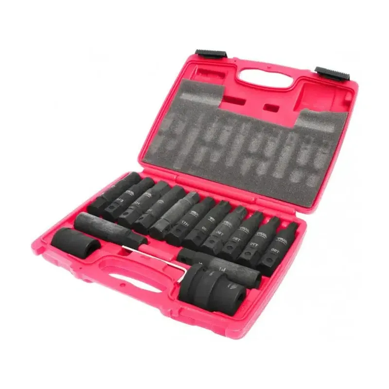 В набор входят 16 головок, выполненных из прочной хромомолибденовой стали, обеспечивающей стойкость к износу и долговечность. Размеры головок варьируются, что позволяет работать с различными типами крепежа, включая торксы и шестигранники. Головки легко монтируются на стандартные 3/4-дюймовые воротки и адаптированы для ударного крепежного инструмента, обеспечивая быстрое и надежное соединение.