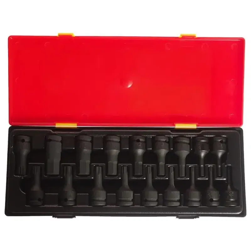 В набор входит 18 головок различных форм, в том числе TORX, HEX и SPLINE, что предоставляет универсальное решение для работы с разнообразными крепежными изделиями. Головки имеют стандартный размер 60мм и разработаны для использования с дюймовыми 1/2" приводами. Преимущества использования данного набора заключаются в долговечности материалов, устойчивых к высоким нагрузкам, а также в гладкой поверхности, обеспечивающей легкость в использовании и минимальное проскальзывание.