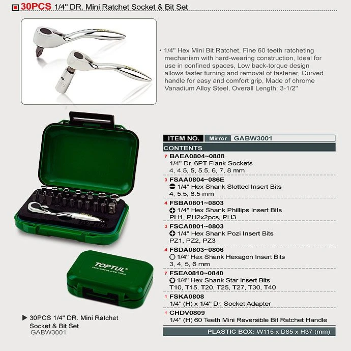 Комплект инструментов, известный как набор инструмента 1/4" 30ед. GABW3001, представляет собой идеальное решение для профессионалов и любителей ремонта. В набор входит 30 единиц, что делает его универсальным помощником для работы с различными крепежами. Изготовленный из прочного материала CR-V, он гарантирует долговечность и надежность в использовании. Производитель данного набора – компания TOPTUL, зарекомендовавшая себя на рынке качественного электротехнического оборудования.