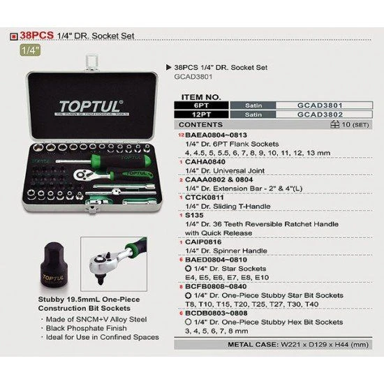 Набор профессионального инструмента TOPTUL GCAD3801 включает в себя 38 единиц высококачественного оборудования, что делает его идеальным выбором для работы в ограниченных пространствах. Этот набор предназначен для использования как в автомобильной сфере, так и для различных ремонтных работ, предлагая широкий спектр возможностей.