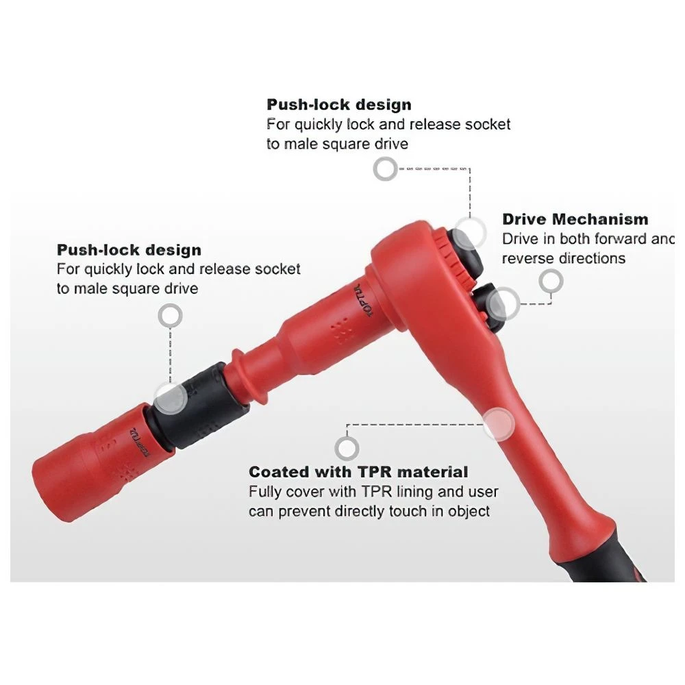 Каждый элемент набора, включая электроизолированную трещотку, удлинители и торцевые головки, выполнен из высококачественных материалов, что гарантирует безопасность и эффективность в работе с электрическими системами. Важным преимуществом является наличие пожизненной гарантии на заводской брак, что подтверждает высокие стандарты качества компании TOPTUL.