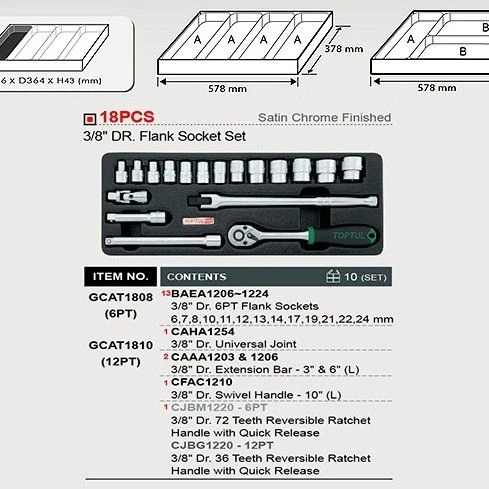Комбинированный инструментальный набор от известного тайваньского производителя TOPTUL — идеальное решение для профессионалов и любителей, ценящих качество и многофункциональность. Набор GCAT1808 включает в себя 18 единиц инструмента с присоединительным профилем 3/8", что позволяет легко выполнять широкий спектр задач, от мелкого ремонта до сложных сборок.