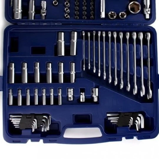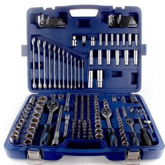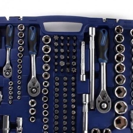 Данный набор включает в себя множество необходимых инструментов, таких как трещотки, гнездовые головки, удлинители, карданные соединения, а также бит и ключи различных типов и размеров. Это позволяет выполнять широкий спектр работ, начиная от мелкого ремонта до более сложных задач. В частности, в комплекте можно найти: