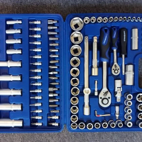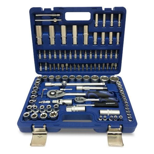 Набор инструментов STM-0108-6 включает в себя разнообразные элементы, обеспечивающие максимальную функциональность. Комплектация содержит трещотки, головки различных форматов, удлинители, кардан, свечные головки и битодержатель, позволяя легко и быстро справляться с любыми задачами. Все инструменты упакованы в прочный пластиковый кейс, обеспечивающий удобство хранения и транспортировки.