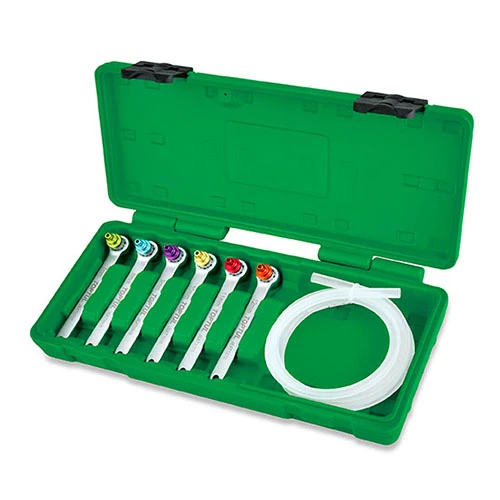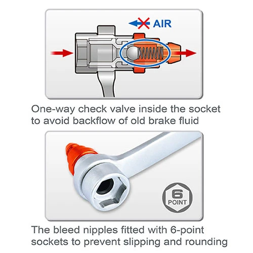 Основная задача набора — прокачка тормозов без необходимости снимать колеса или поднимать автомобиль. Он оснащен прямым встроенным односторонним клапаном-проверкой, предотвращающим возвращение старой тормозной жидкости или исчерпанного воздуха, тем самым повышая безопасность и эффективность процесса прокачки. Ключи отличаются своей конструкцией: благодаря интегрированной гибкой гайке они идеально подходят для штуцеров, упрощая процесс расслабления и затяжки.