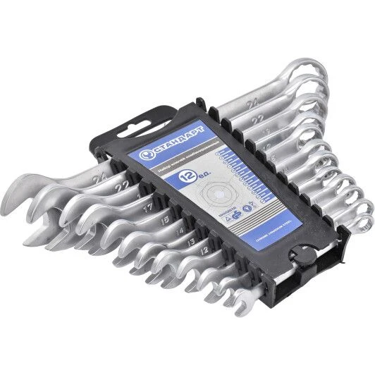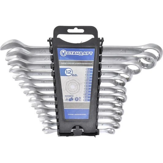 Комбинированные ключи – незаменимый инструмент для работы в механике и бытовых ремонтах. Набор ключей комбинированных 12 единиц от производителя Стандарт (Индия) предлагает широкий выбор размеров, необходимых для выполнения различных задач. Артикул товара: NKK12STA. Этот набор включает ключи размером от 8 мм до 24 мм, что делает его идеальным для работы с болтами и гайками разных диаметров.