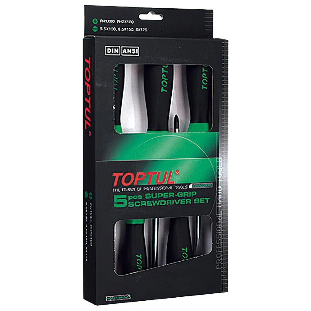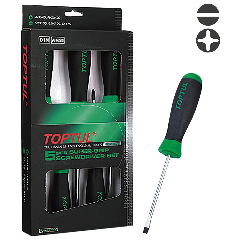 Набор отверток 5 единиц (PH, SL) от известного тайваньского производителя TOPTUL представляет собой идеальный инструмент для выполнения широкого спектра слесарных и ремонтных работ. Каждая отвертка в комплекте предназначена для надежного вкручивания и отвинчивания крепежных деталей, что делает этот набор незаменимым как для профессионалов, так и для домашних мастеров.
