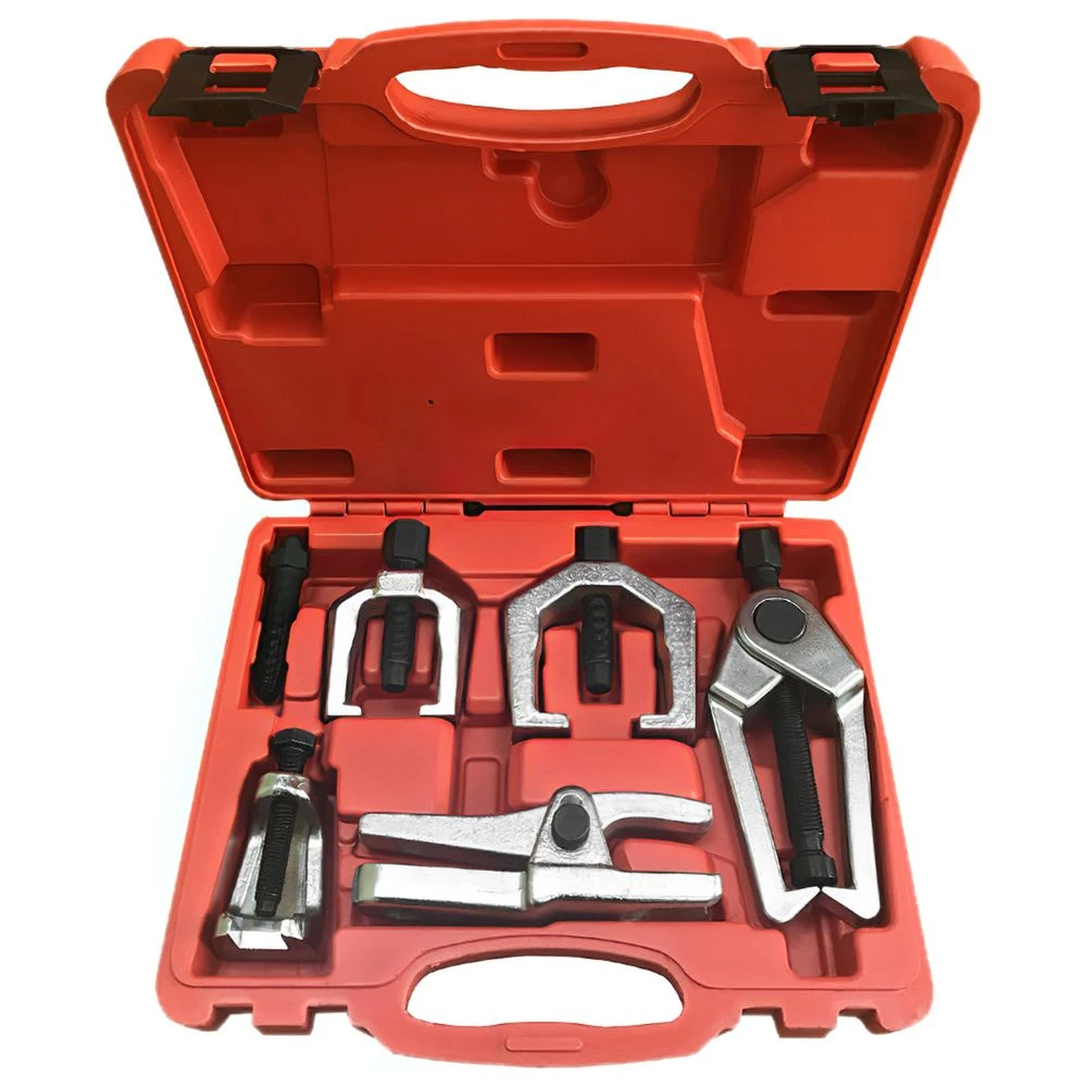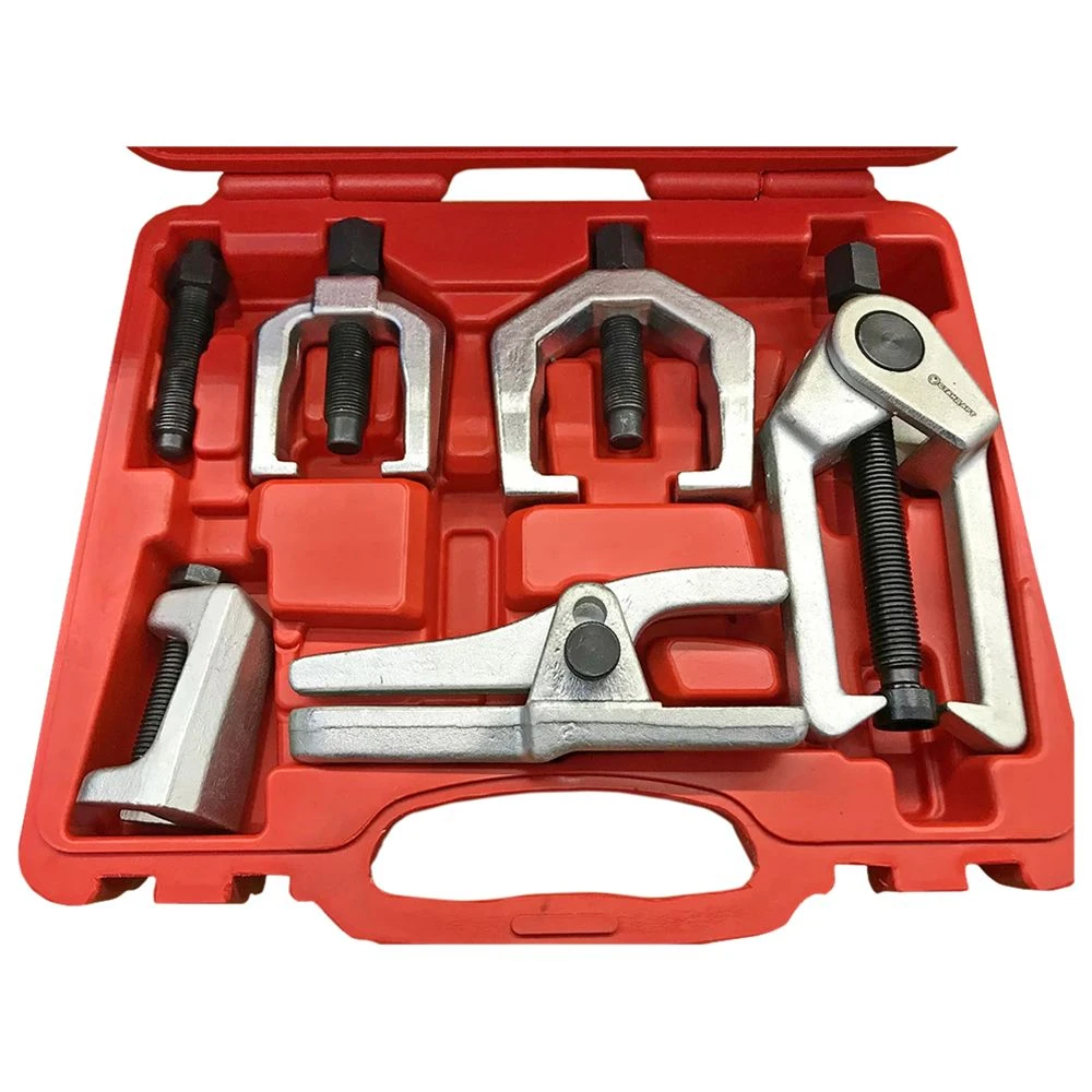Отличительной особенностью набора является наличие как винтовых, так и рычажных съемников, что делает его универсальным инструментом для различных автомобилей. В комплекте представлены съемники, позволяющие безопасно и эффективно работать с шаровыми опорами, что особенно важно для предотвращения повреждений деталей при демонтаже.