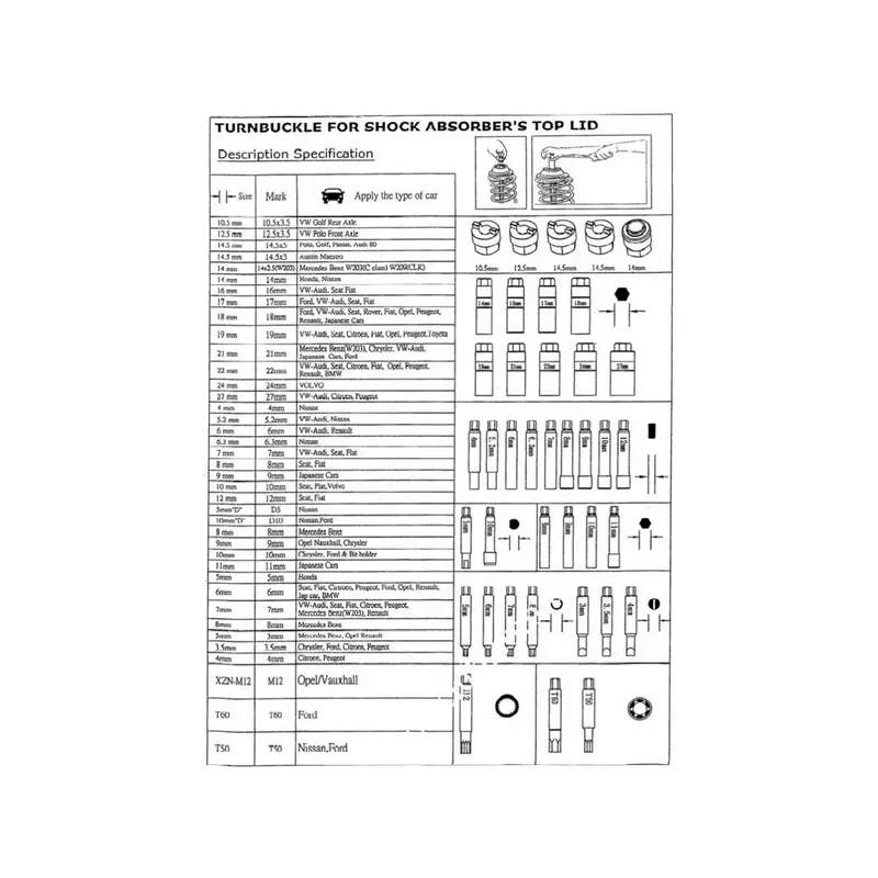 Набор включает 39 различных ключей, обеспечивающих универсальное решение для работы с амортизационными стойками. Ключи выполнены из прочной стали, что гарантирует долговечность и устойчивость к износу. Каждый ключ удобно хранится в специальном пластиковом кейсе, упрощая транспортировку и организацию рабочего пространства. Монтаж ключей прост и не требует дополнительных инструментов, что обеспечивает быстрое и эффективное выполнение ремонтных работ.