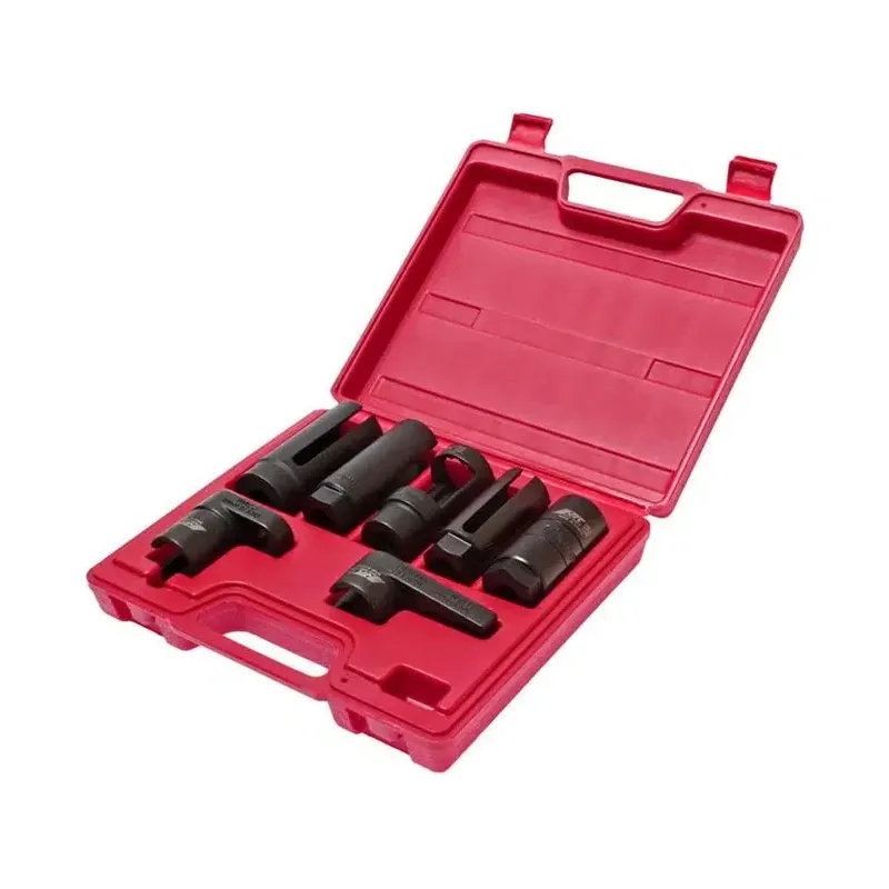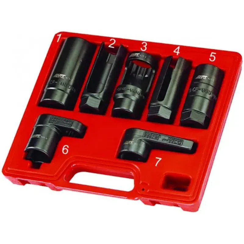 Состав набора включает 7 специализированных головок, выполненных из прочной стали, обеспечивающей долговечность и надежность в эксплуатации. Каждая головка точно соответствует размерам, что облегчает снятие форсунок и датчиков, способствует увеличению скорости работы и минимизации риска повреждения элементов автомобиля. Набор удобно хранить и транспортировать благодаря компактному кейсу.