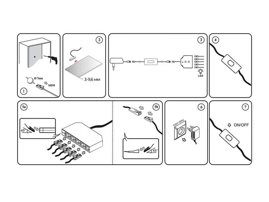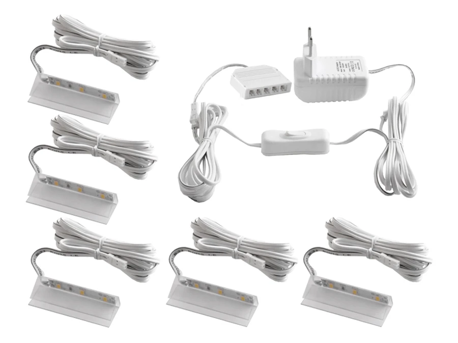 Каждая клипса имеет прозрачный пластиковый корпус, оптимальные габариты 60×22×12 мм и предназначена для установки на стекло толщиной от 3 до 9,6 мм. Работают от стандартной сети 220 В при мощности 3.6 Вт и стабильной цветовой температуре 6500 К. В набор входят пять источников света с ручным выключателем для удобного управления локальной подсветкой. Степень защиты IP20 указывает на предназначение для внутренних сухих помещений.