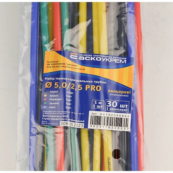 Набор термоусадочных трубок A0150040642 от производителя АСКО-УКРЕМ предназначен для электроизоляции жил проводов и кабелей, а также для декоративных целей. В комплект входит 30 трубок длиной 1 метр с диаметром до усадки 5 мм и после усадки 2,5 мм, что делает этот набор идеальным для различных электротехнических применений.