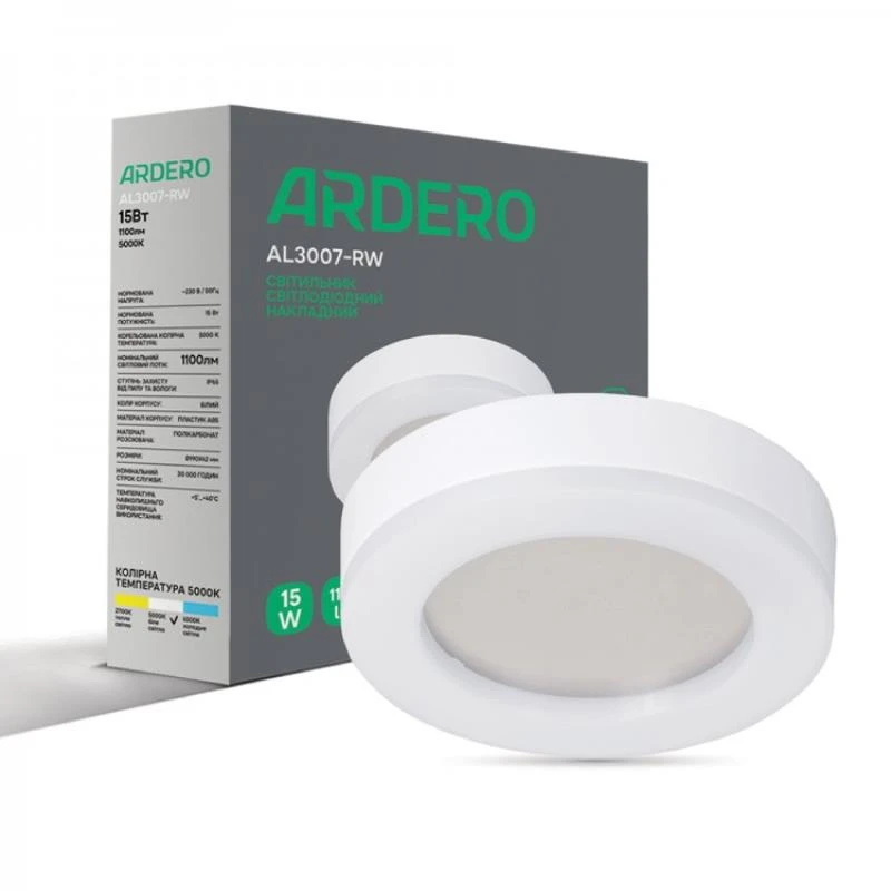 Накладной светодиодный светильник Ardero AL3007-RW 15Вт 5000К IP65 белый - это современное освещение от известного производителя Ardero, предназначенное для обеспечения высококачественного освещения в помещениях с повышенной влажностью и не только. Модель сочетает в себе стильный дизайн и передовые технологии, делая ее идеальным решением для многих областей применения.