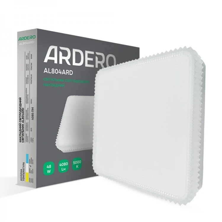 Накладной светодиодный светильник AL804ARD 48W квадрат декор — это универсальное решение для освещения, которое идеально подходит как для жилых, так и для коммерческих помещений. Изготавливаемый известным производителем Ardero, этот светильник отличается современным дизайном и высокими эксплуатационными характеристиками. Его артикул – 8021. Светильник выполнен из легкого и прочного пластика, что делает его монтаж простым и удобным.
